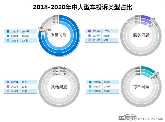 据车质网数据显示,质量类问题依然是2020年中大型车投诉的重点,单纯质量问题的投诉量以及占比均较2019年有所提升。此外,继2019年中大型车的服务问题呈现出爆发式增长后,2020年中大型车的服务问题投诉量和投诉占比均出现回落,但投诉量仍保持在相对高位。从服务问题近三年来的变化趋势来看,一方面,国内中大型车消费者对于企业和经销商的服务水平和服务质量愈加重视,对待服务类问题的容忍度在降低;另一方面,国内汽车企业对于服务的重视程度也在提升,对于多发的服务问题在不断进行优化和调整。