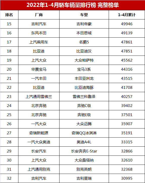 今年1-4月累计销量超过3万辆的轿车还包括:奇瑞QQ冰淇淋销量35191辆,排名第27位;长安奔奔E-Star销量32866辆,排名第29位;大众桑塔纳销量32368辆,排名第30位;吉利星瑞销量30995辆,排名第32位,表现不如去年。