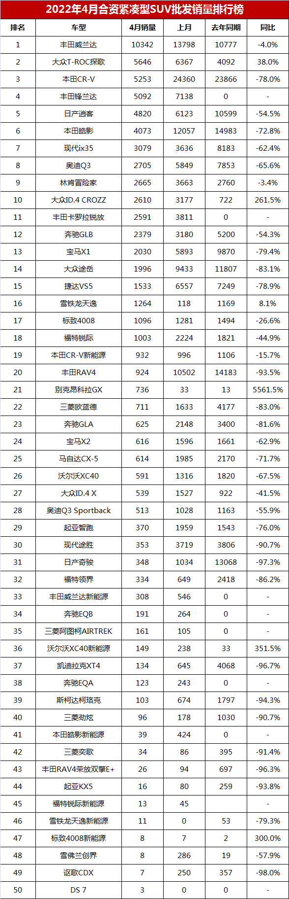 作为上月合资紧凑型SUV销量冠军的本田CR-V,4月份批发销量低至5253辆,排名第三位,同比下降78.0%。丰田锋兰达销量也超5千辆,以5092辆的销量排名第四位。