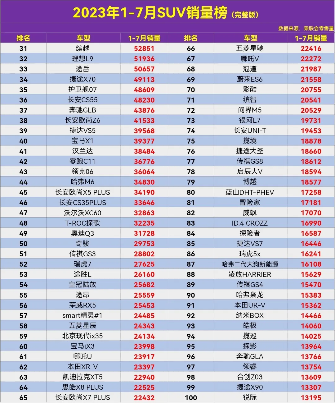 导读:不得不说2023年是车市最卷的一年,各车企为保销量,不得不降价促销,竞争可是相当的激烈,最后谁才是赢家呢?来看看2023年1-7月SUV零售销量排行榜吧,1-313名!乘联会数据显示,仅有7款车型销量突破10万辆,表现最佳的是特斯拉ModeI Y,拿下排行榜冠军,比亚迪宋PLUS亚军,元PLUS季军,长安CS75PLUS反超哈弗H6,拿下燃油车第一,广汽埃安AION Y、宋Pro新能源都双双超越10万辆。真惨,2023年1-7月SUV销量榜,宋PLUS丢冠,荣放第9,逍客第24名!