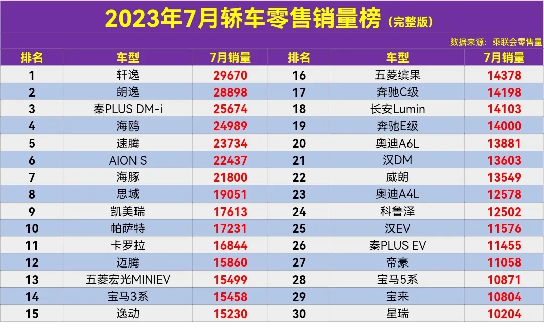 导读:最新消息!今天一早从乘联会处获悉,2023年7月轿车零售销量排行榜完整版正式出炉,1-200名!日产轩逸依旧是最受欢迎车型,成功卫冕冠军,大众朗逸紧跟其后,排行榜第二名,比亚迪秦PLUS DM-i季军,大众速腾、广汽埃安AION S、海豚都超2万辆大关,本田思域突然爆发,回归前十名俱乐部,丰田凯美瑞依旧是B级车冠军,反观本田雅阁却不好过了,排名跌至43名,销量仅7千来辆。心酸了,2023年7月轿车销量榜,轩逸夺冠,思域第8,雅阁仅第43名!