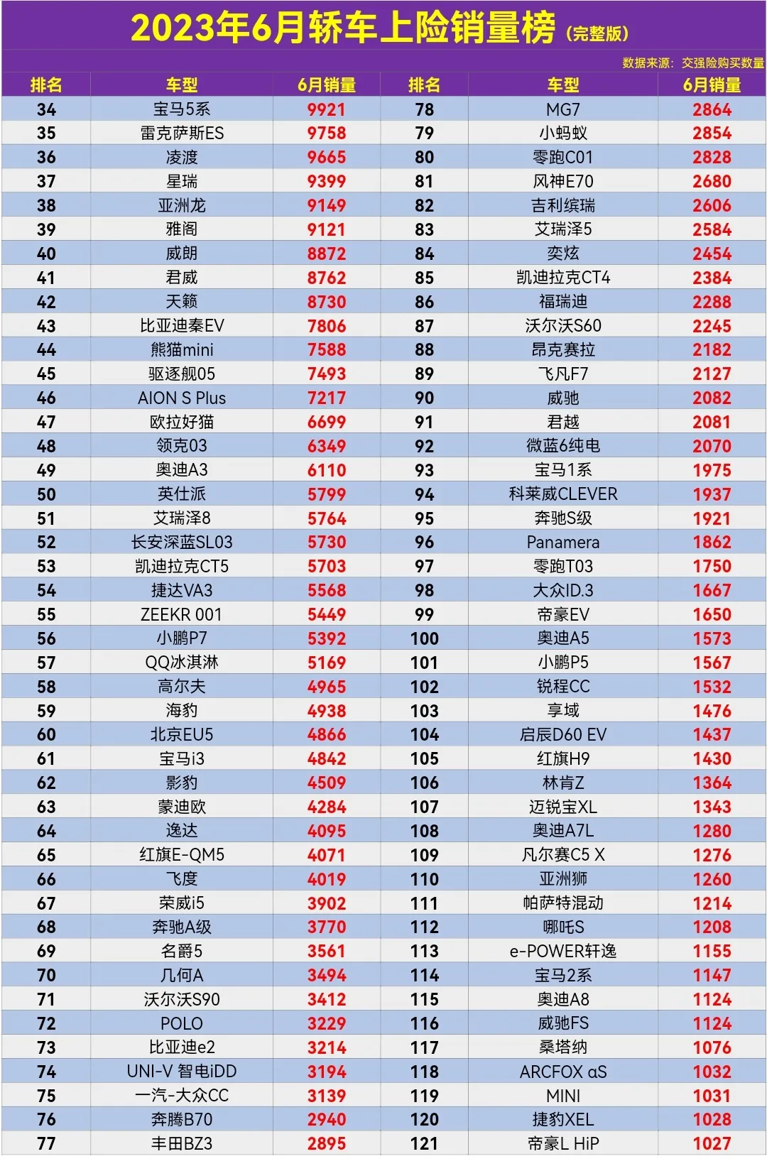 再来看看第34-121名,宝马5系、ES、星端、雅阁都9千多辆,艾瑞泽8、长安深蓝SL03、凯迪拉克CT5都只有5700多辆,海豹、影豹、蒙迪欧都不足5千辆,表现都很一般,昂克赛拉、飞凡F7、君越都仅有2千多辆,很不理想。