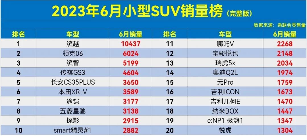 导读:近几个月,小型SUⅤ的市场表现不是很乐观,本田双星XR-V、缤智也惨遭暴跌。从乘联会处获悉,2023年6月小型SUV零售销量排行榜公布,1-49名!仅有一款车型吉利缤越销量超万辆,领克06亚军,本田缤智季军,传祺GS3、长安CS35PLUS位居第四、第五名,本田XR-V、途铠、五菱星驰、探影都入榜前十名,但销量都不足4千辆。心酸了,6月小型SUV销量榜,缤越夺冠,传祺GS3第4,XR-V第6名!