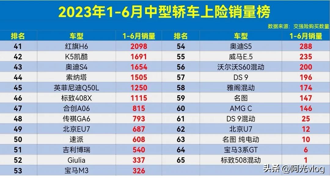 导读:车市竞争激烈,中型轿车也不例外,真是有人欢喜有人忧,凯美瑞、雅阁依旧坚挺,天籁惨遭暴跌,比亚迪海豹后劲不足。来看看2023年1-6月中型轿车上险销量排行榜吧,数据依据:新车交强险购买数量,包含进口车共65款车型上榜,丰田凯美瑞表现最佳,夺得排行榜冠军,特斯拉ModeⅠ 3亚军,本田雅阁季军,大众帕萨特、迈腾双双杀进前五名,豪车奔驰C级、宝马3系、奥迪A4L都入榜前十名。真惨,1-6月中型轿车销量榜,ModeⅠ 3亚军,天籁第11,海豹第仅17名!