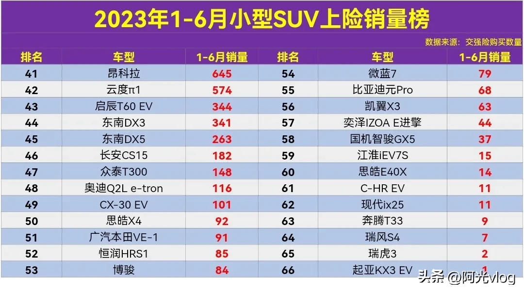 最后是第41-66名,昂科拉只有645辆,长安CS15仅182辆,思皓Ⅹ4、博骏、元Pro、现代ix25都不足百辆,非常的惨淡。