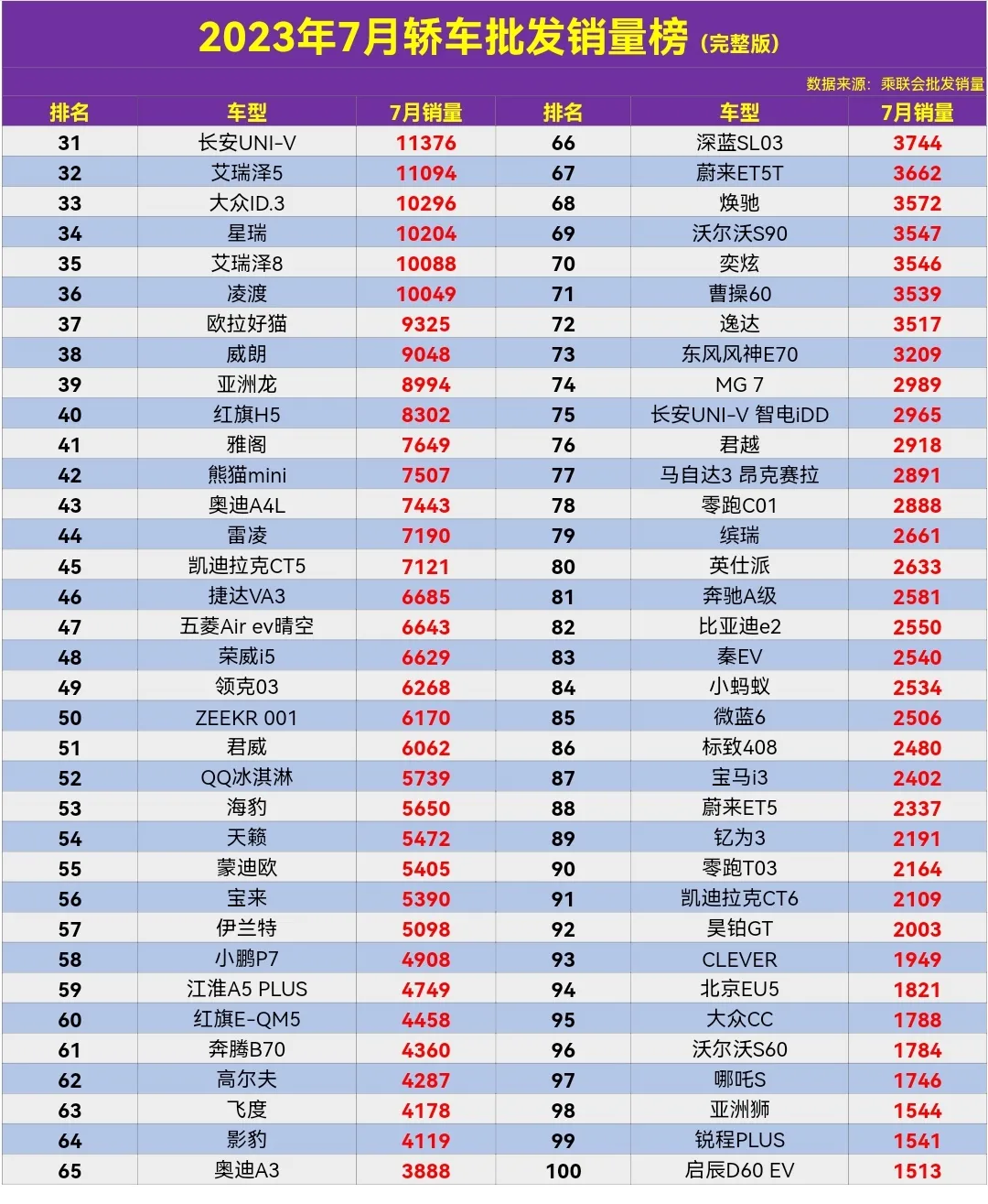 导读:从乘联会处了解到,2023年7月轿车批发销量排行榜完整版公布,共181款车型上榜,销量超万辆的有36款,表现最佳的是大众朗逸,夺得排行榜冠军,比亚迪海豚亚军,秦PLUS DM-i季军,海鸥、轩逸都进前五名,AION S、卡罗拉、ModeI 3都超2万辆,帕萨特、迈腾、奔驰C级都入榜前20名,汉EⅤ、星瑞、艾瑞泽8都超万辆。2023年7月轿车批发销量榜,朗逸夺冠,轩逸第5,艾瑞泽8第35名!