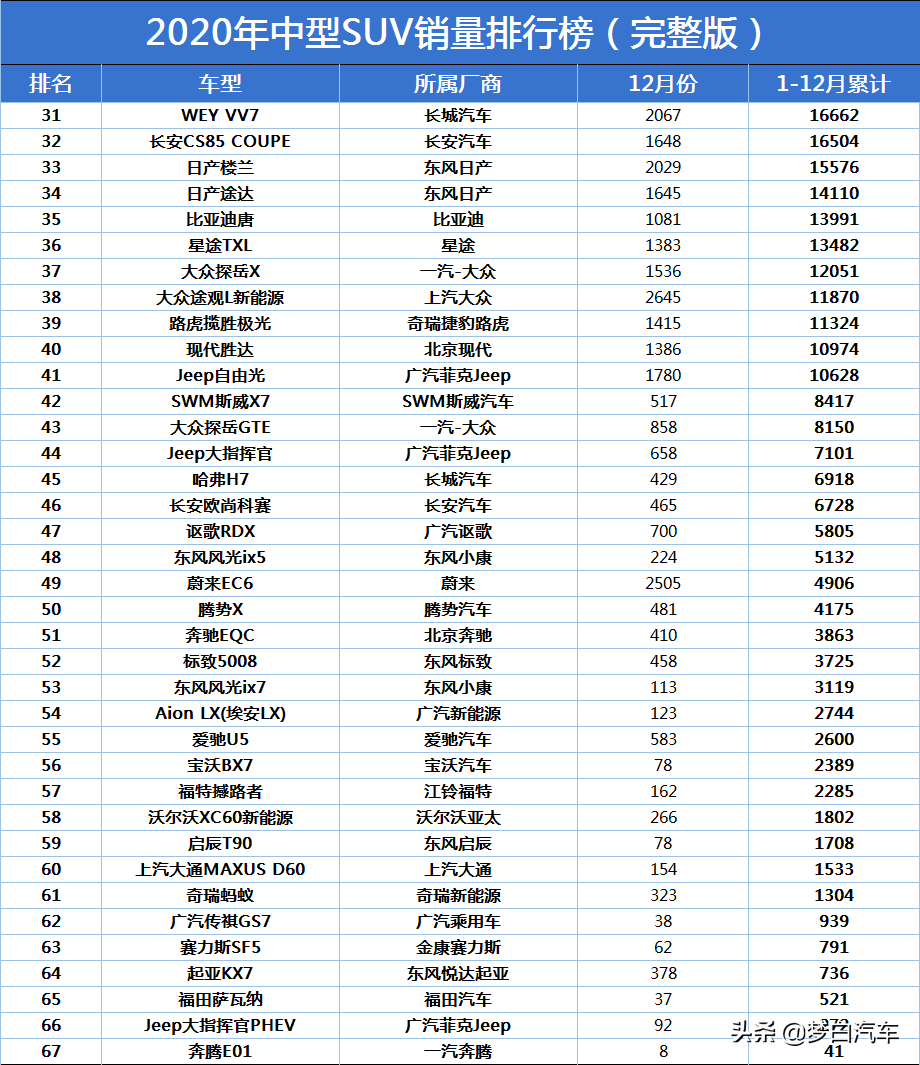 最后是排名31-67位的中型SUV,WEY VV7仅排名31位,2020年总销量为16662辆,日产楼兰仅排名33位,日产途达排名第34位,现代胜达排名第40位,Jeep自由光排名第41位,哈弗H7排名第45位,它们都是品质很不错的中型SUV,但在销量方面的表现都很一般。对于2020年中型SUV销量排名(完整版),途观L夺得冠军,瑞虎8再进前十,大家怎么看?